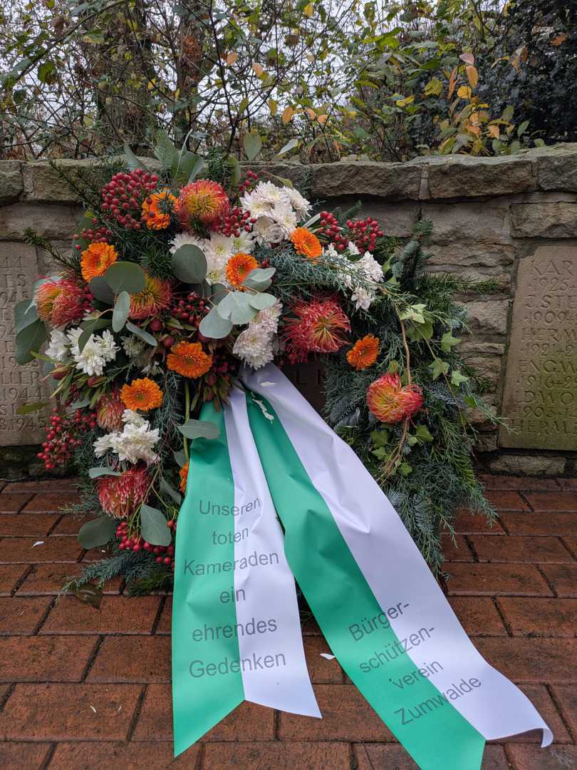 Am 16. November versammelten sich knapp 60 Schützenschwestern und Schützenbrüder des BSV Zumwalde am Kriegerehrenmal in Obersteinbeck, um der Opfer von Krieg, Gewalt und Verfolgung zu gedenken. Die Kranzniederlegung wurde wie im vergangenen Jahr von Trompetenspiel begleitet, das dem Gedenken einen würdevollen Rahmen verlieh.